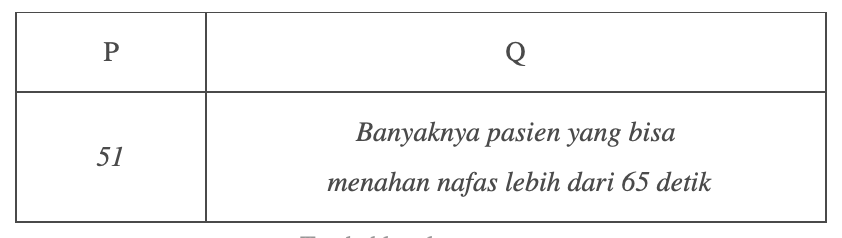 - Tabel berikut menyajikan informasi tentang durasi seseorang bisa menahan nafas untuk uji kondisi kesehatan paru-paru 200. pasien covid-19.